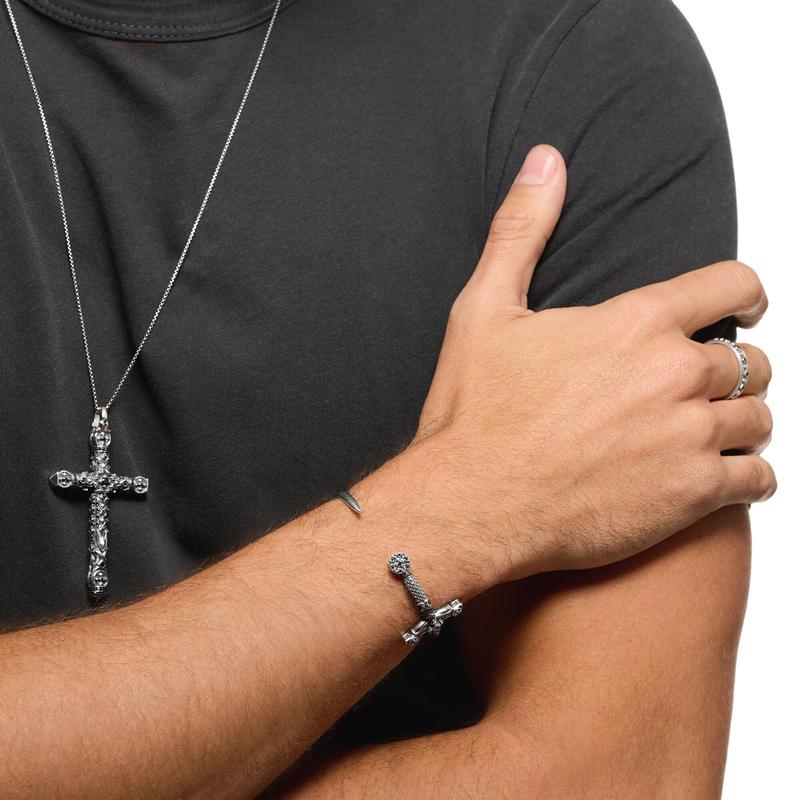 Unleash your inner warrior with this captivating sword-inspired bangle! Handcrafted with astonishing detail, this sterling silver accessory wraps comfortably around your wrist, bringing ancient tales to life. Adorned with royal ornamentation and sparkling black zirconia, it's perfect for those who dare to express their bold spirit. Available in two sizes, this exceptional piece truly makes a statement.