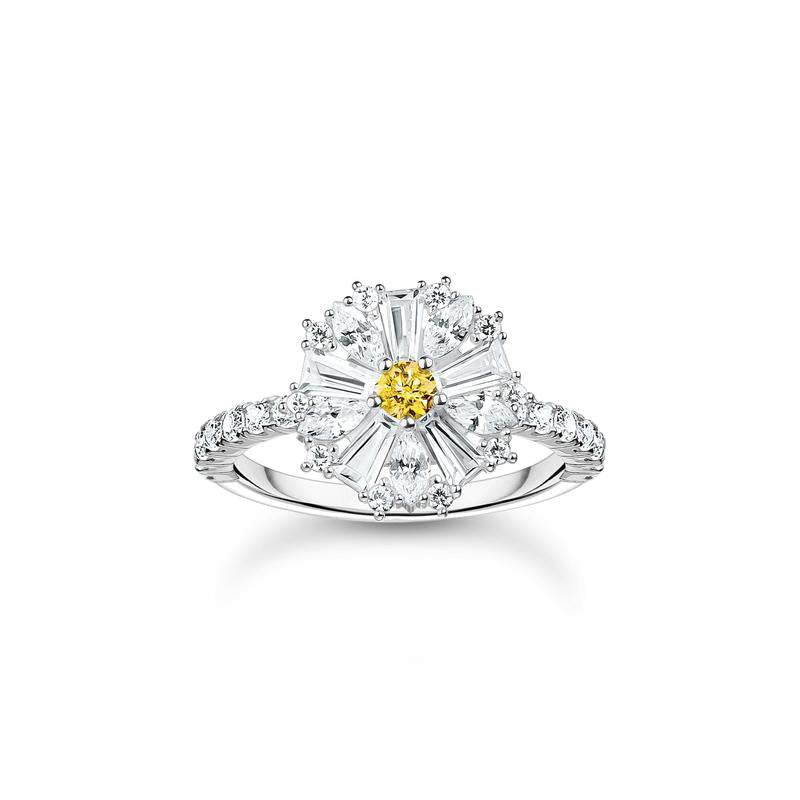 Dive into a dreamy world with this playful daisy cocktail ring, crafted sustainably with utmost care. The daisy center, adorned with dazzling white and yellow zirconia stones, is sure to capture everyone's attention. More white zirconia stones grace the ring band, enhancing the bloom's sparkle, creating a design that celebrates nature's beauty and symbolizes loyalty and trust. This ring is a delightful treat for your favorite person, perfect solo or paired with matching THOMAS SABO pieces.