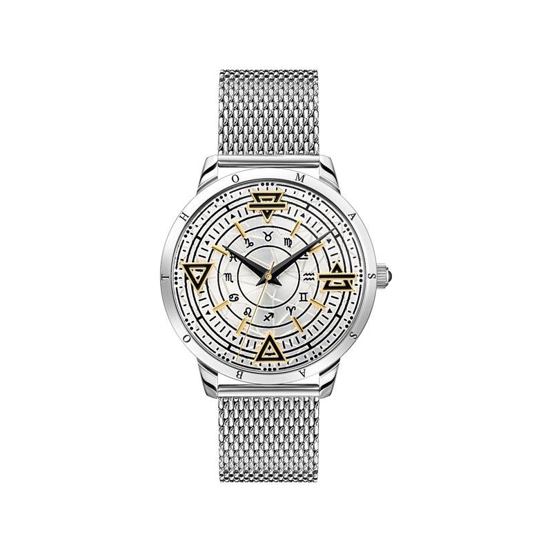A watch inspired by the power of the elements: fire, water, air and earth, as well as their respective zodiac signs, are the highlights of this ladies’ and gentlemen’s watch. Elaborately crafted, finely engraved lines in a two-tone design and black hands on a silver dial add to the watch’s eye-catching appeal and reflect a sense of adventure. A small, additional decorative detail: a polished onyx adorns the crown for setting the time. The THOMAS SABO branding on the bezel is accompanied by a comfortable, individually length-adjustable Milanese watch strap to round off this sophisticated timepiece to perfection.