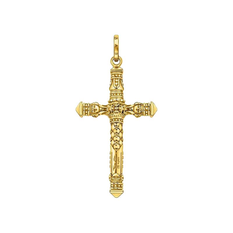 Large cross pendant with artistic details – Appealing texture thanks to the raised textures, pyramid studs and skull details – Exceptionally high quality thanks to the refinement of the 925 sterling silver with 18 carat gold plating – Hand-finished masterpiece in a three-dimensional look – Eyelet with THOMAS SABO engraving