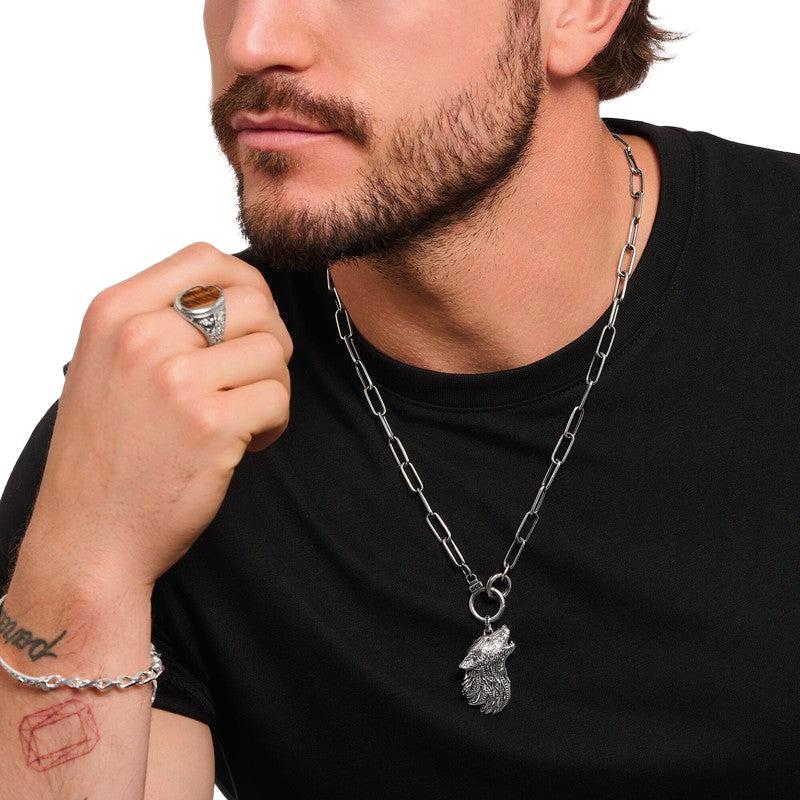 This necklace made of recycled, blackened silver is an eyecatcher thanks to its prominent, oval-shaped chain links. Its two ring clasps enable a variety of combinations with pendants. The bigger clasp is set with small, black zirconia stones. You can wear this necklace by itself or create a layering look with further necklaces from our THOMAS SABO portfolio.