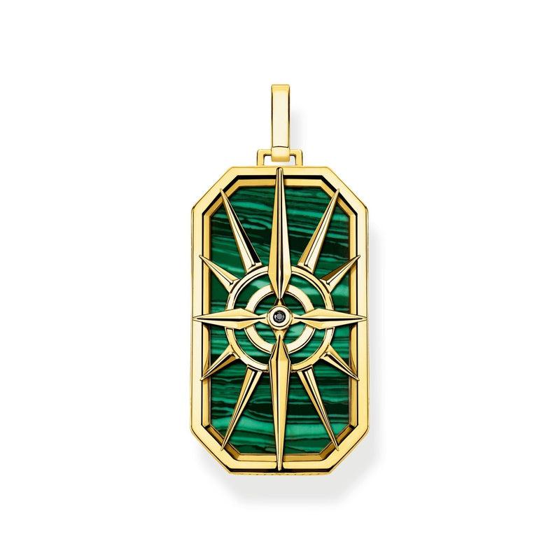 Large pendant with a stylised compass motif Maritime-inspired symbolism – Shiny, polished inlay made of imitation malachite, held in a precise prong setting – Highly detailed multilayered design thanks to the facet-cut frame and eyelet – Fine cord texture at the sides – Highlight: Each pendant is unique thanks to the varied texture of the inlay