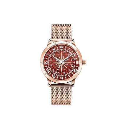 Magical feminine Cosmos watch by THOMAS SABO in the colour rose gold: The highlight of the model is the elaborately crafted, two-layered and bordeaux-red painted dial. There is a symphony of cosmic forces in the unmistakable THOMAS SABO love of detail. Based on a 3D sun motif, the dial is richly decorated with zodiac signs, star applications and Roman numerals. To make it easier to read the seconds, it is subdivided a further 60 times - a second hand makes each of these subdivisions particularly special, because with its filigree star shape it is the highlight of the three silver-coloured hands.