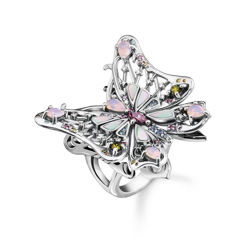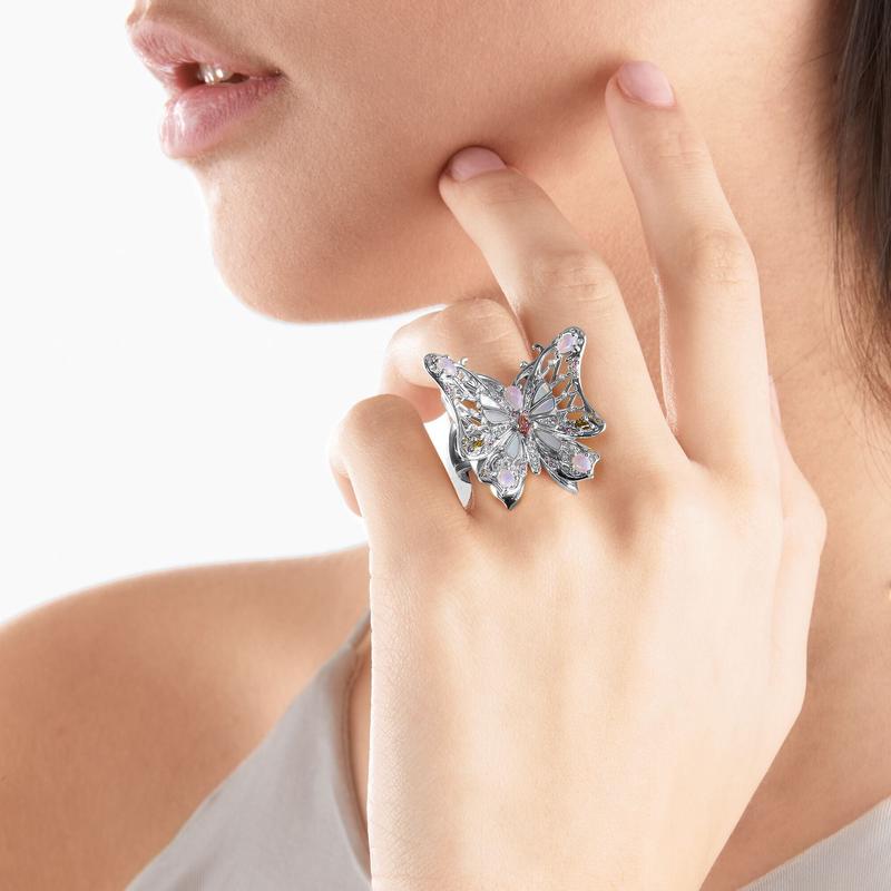 Like a delicate butterfly that has gracefully landed on your finger, this ring is truly enchanting. Its expressive cut-out design and slightly curved wings make it a standout piece. Adorned with many faceted, colorful stones and mother-of-pearl inlays, each ring is a unique work of art. Crafted from high-quality 925 sterling silver, this ring is sure to captivate with its spectacular design and meticulous attention to detail.