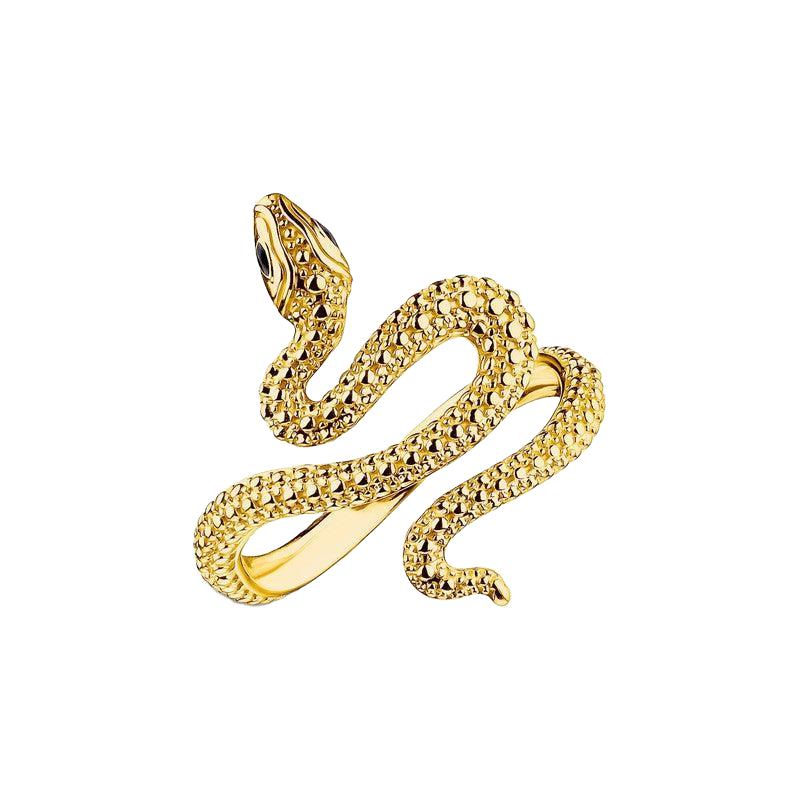 Get swept away by this alluring ring made of recycled silver with elegant 18k gold plating. Its writhing 3D snake is an expressive design detail. Fine engraved lines accentuate its body and represent its scale pattern. Black, hand-painted cold enamel lends its eyes a mystical look. Due to its elaborate design and look, this gold-coloured snake ring tells a very personal story about romance.