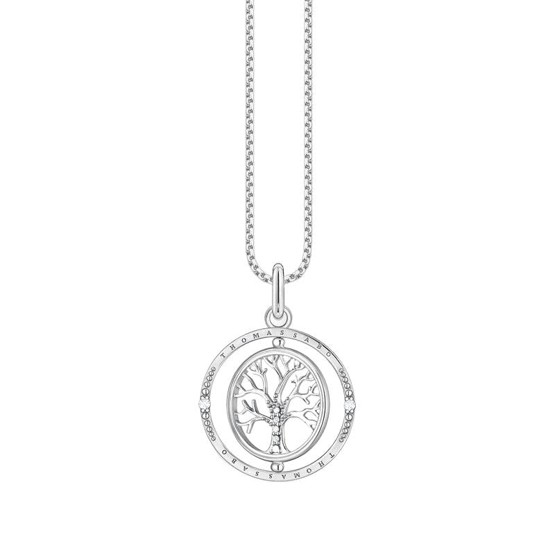 Inspired by nature: The necklace with pendant in Tree of Love design stands for balance in life and love. The cut-out pendant with tree-of-life motif is elaborately crafted, set with white zirconia stones and can be turned on its own axis. The outer ring is decorated with a THOMAS SABO engraving. The ornaments on the front and back are richly detailed so that the pendant can be worn on both sides.