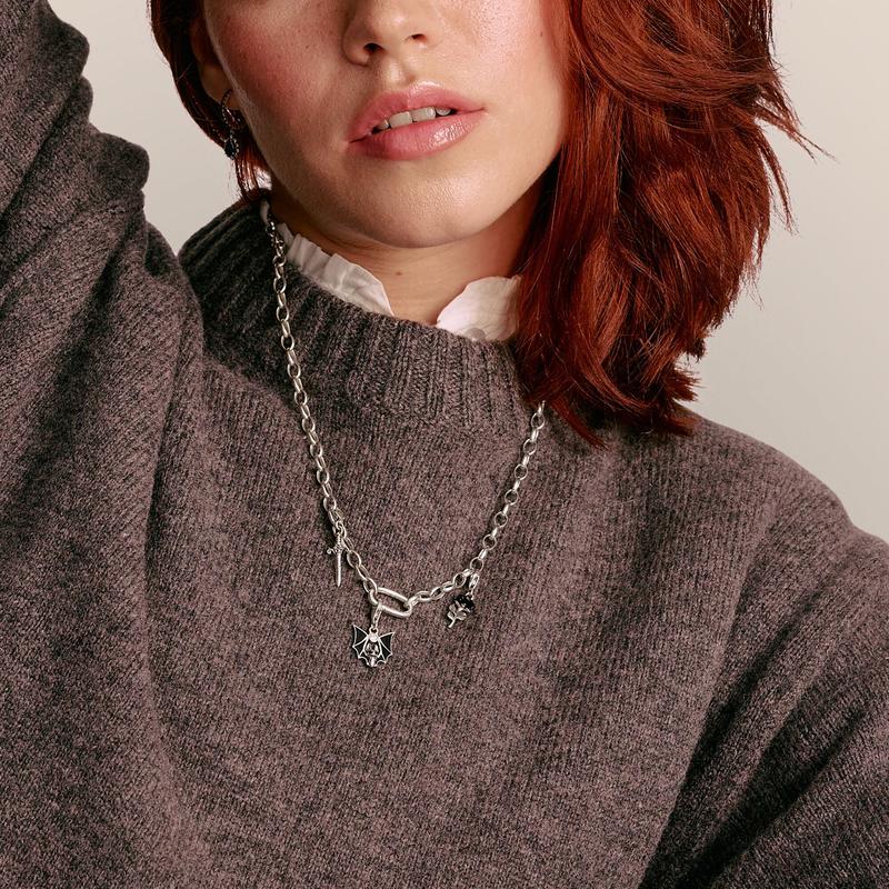 A sleek silver pendant shaped like a sword, sparkling with a black‑and‑white zirconia. Crafted from recycled 925 sterling silver with a blackened finish, it adds a bold touch to any look. Perfect for mixing with Charm Club carriers or wearing solo as a statement piece.