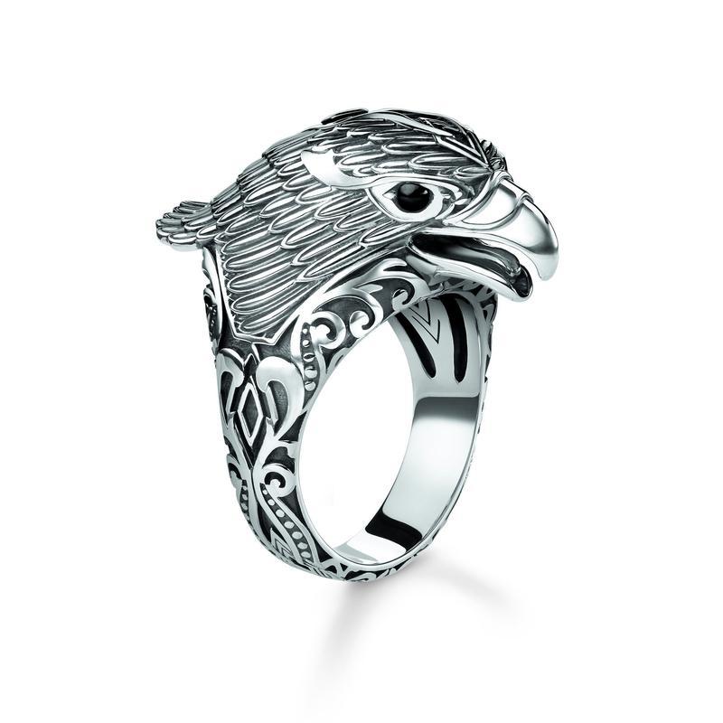 King of the skies: The eagle with onyx eyes and elaborately crafted plumage is a must-have statement ring for rebellious looks. His face merges with the crafted climbing ornamentation, which underlines the royal character of the bird of prey.